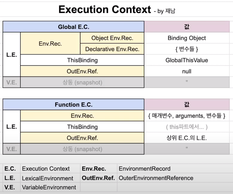 식별자(변수, 함수, 클래스 등의 이름)를 등록하고 관리하는 스코프와 코드 실행 순서 관리를 구현한 내부 메커니즘.