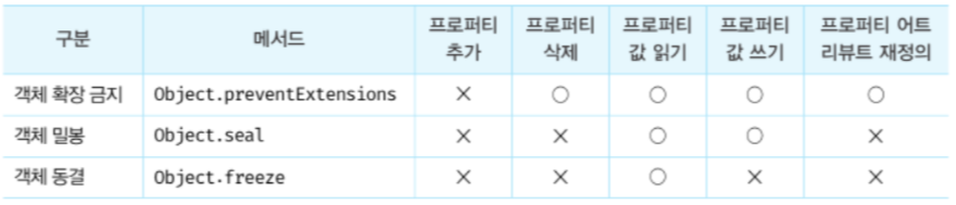 Object.preventExtensions 메서드 : 객체의 확장 금지. 확장이 금지된 객체는 프로퍼티 추가가 금지됨.