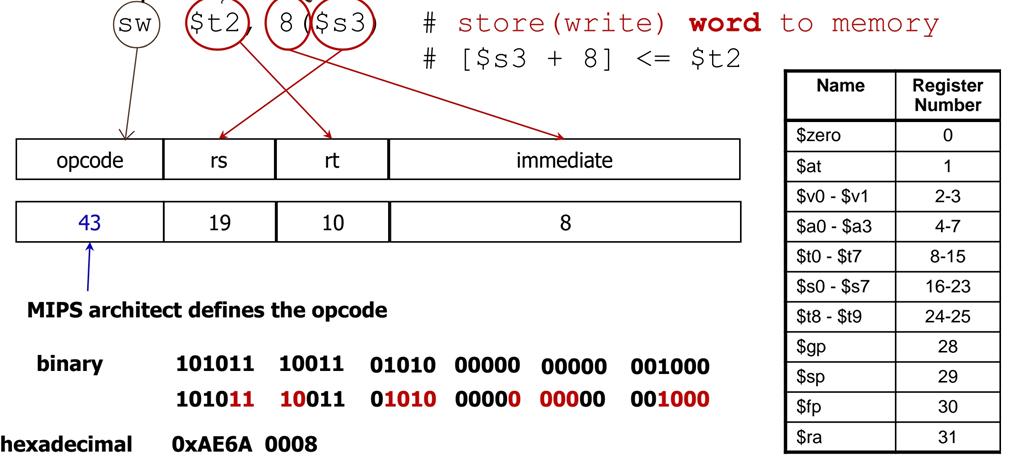 : I-format instruction, stores (writes) a word (32bit) from a register to main memory