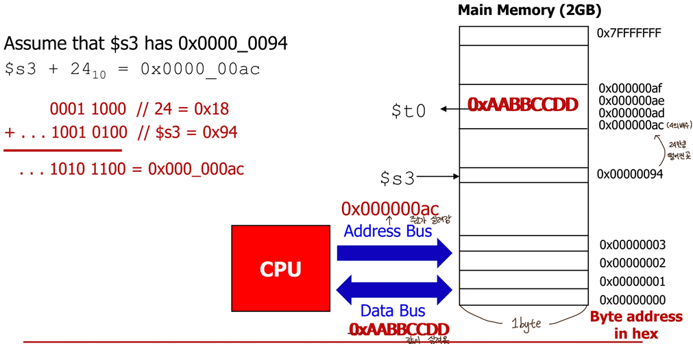 Address Bus를 통해 CPU에서 Main Memory로 $s3+24 이 전달됨