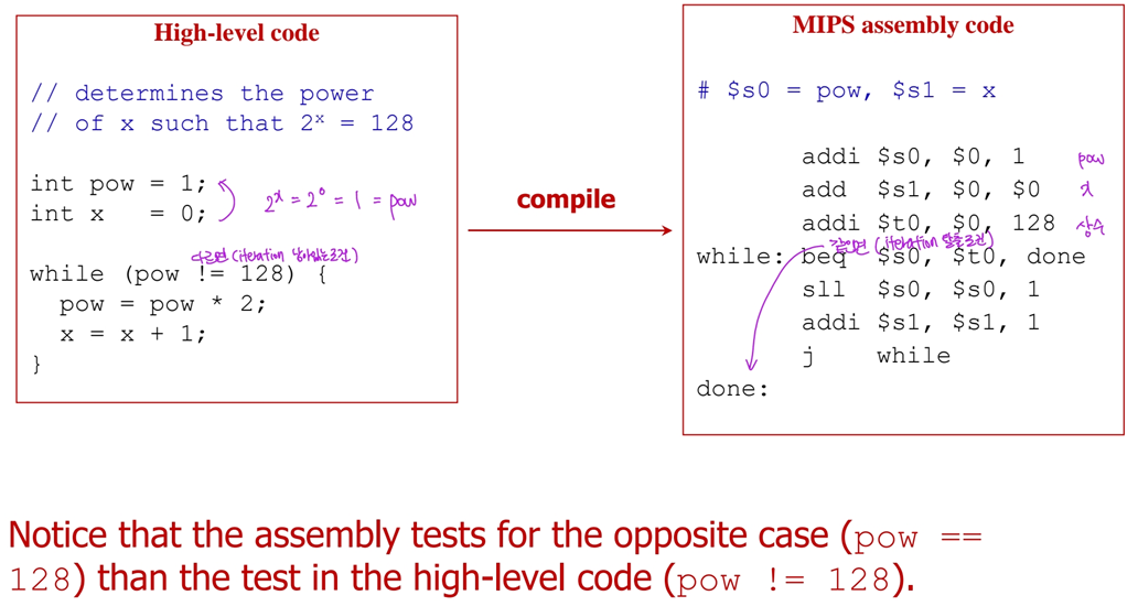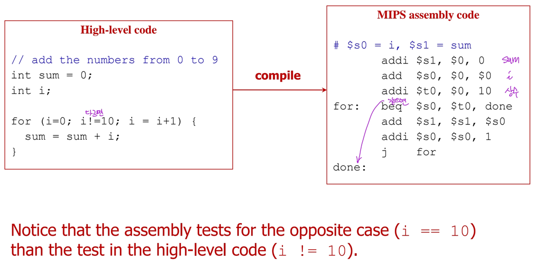 -> bne $at, $zero, Label (s1<s2 이면 0이 아니므로 Label로 분기)