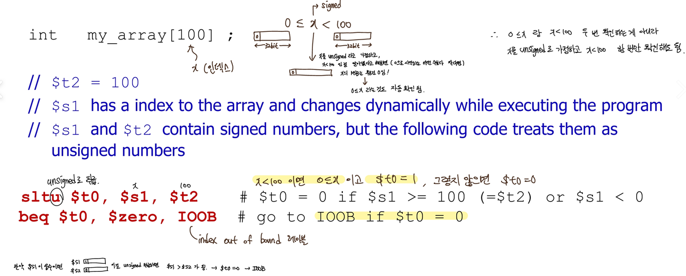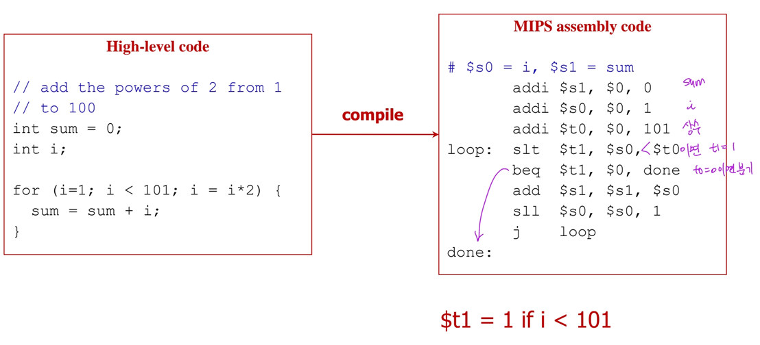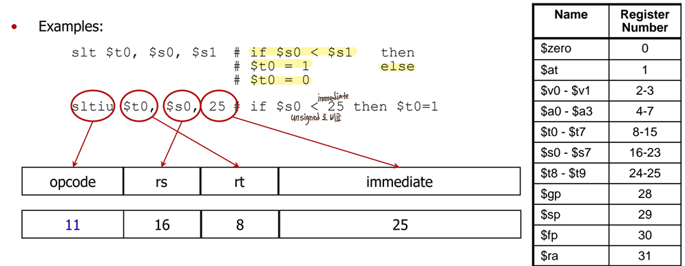 -> slt $at, $s1, $s2 (s1<s2 이면 set $at to 1)