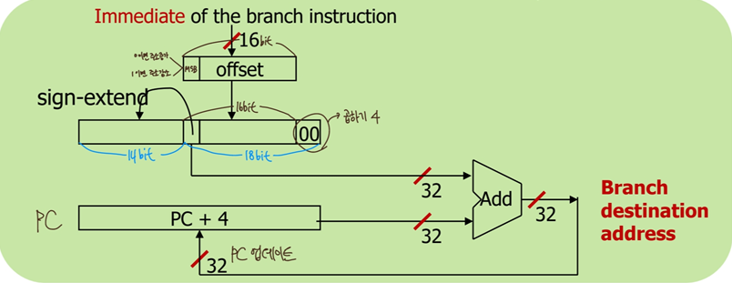 branch 명령어는 immediate field를 offest(점프할 거리)로 사용함.