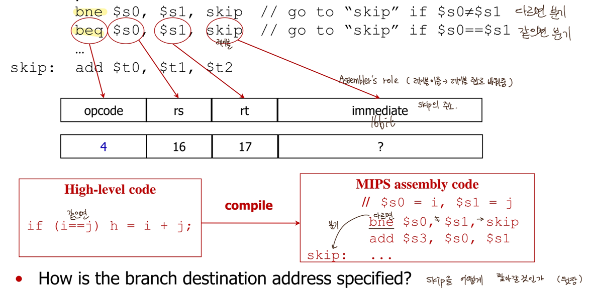 : conditional branch (beq, bne) 는 명령어가 2^15 범위 내에 있을 때만 분기 가능(2^15 * 4byte),