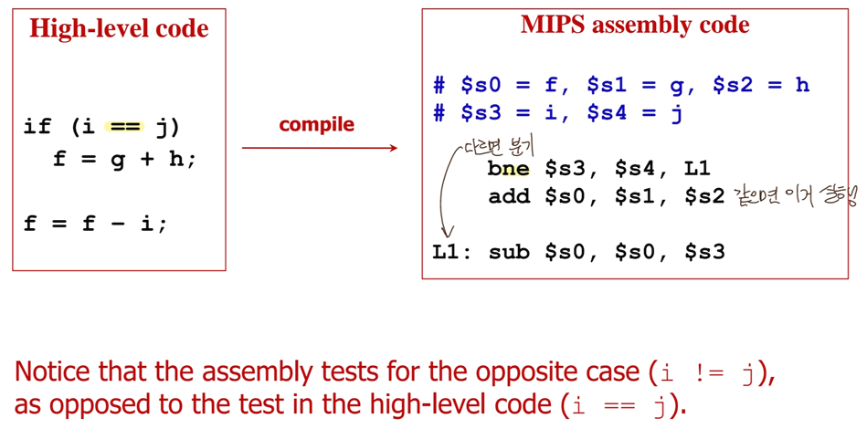 -> rs와 rt가 같으면 특정 레이블로 분기. 뺄셈해서 0인지 확인해서 비교함.