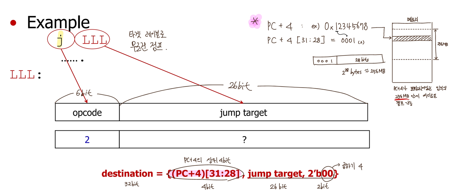 unconditional branch (j, jal, jr) 은 2^28 byte, 즉 256MB 만큼 점프 가능