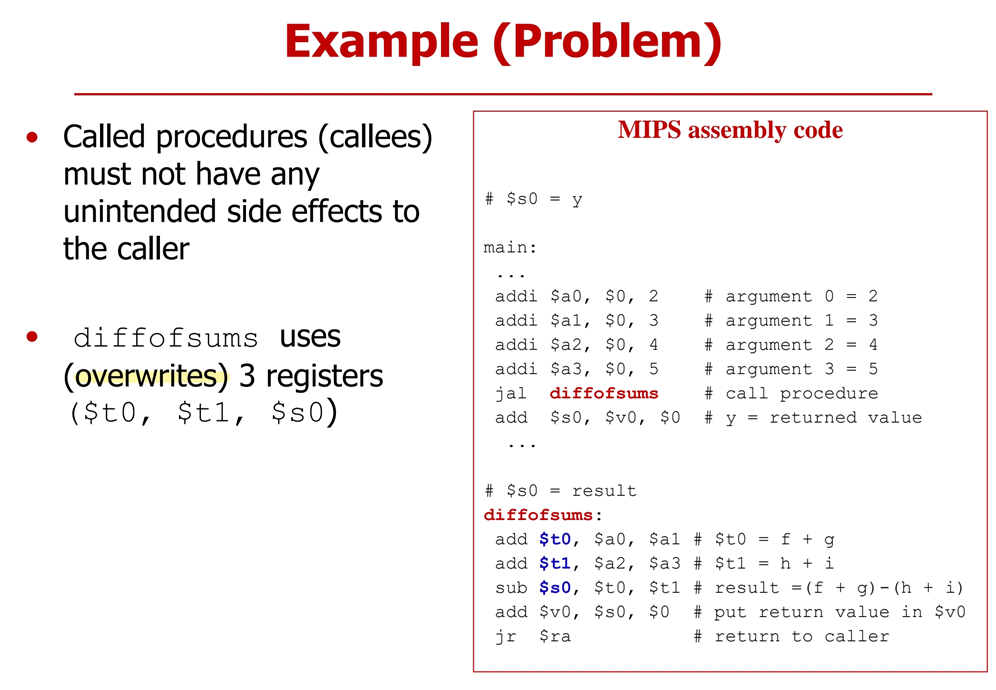 : 앞의 예시에서 만약 caller가 $t0, $t1, $s0 를 callee 호출 후 사용하지 않는다면, spilling&restore 은 헛수고였음.
