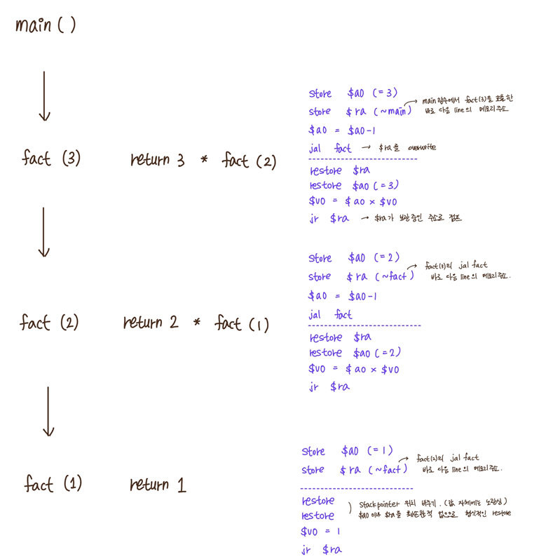 링크 : 리턴 시 pc+4로 돌아올 수 있도록 $ra에 넣어둠. caller가 callee에게 제어권 넘김.