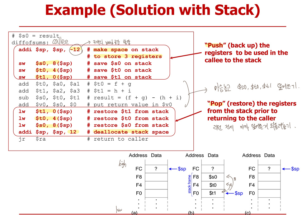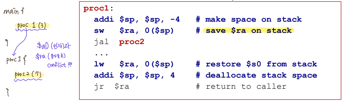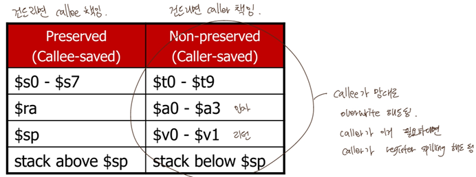 -> 건드리면 callee책임. callee가 $s 쓸거면 spilling&restore 꼭 해야 함.
