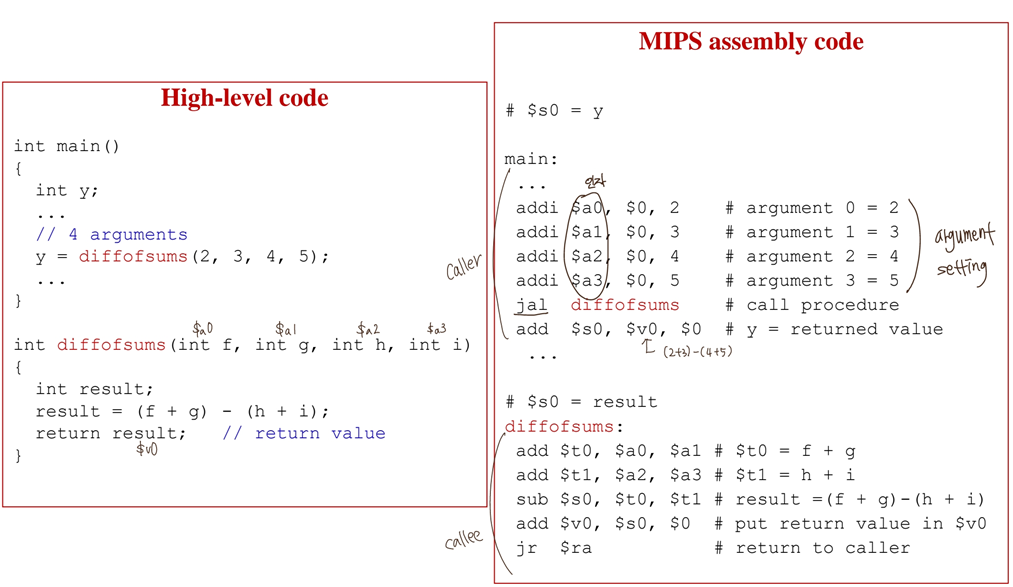 -> 인자 : $a0~$a3 (four argument registers)