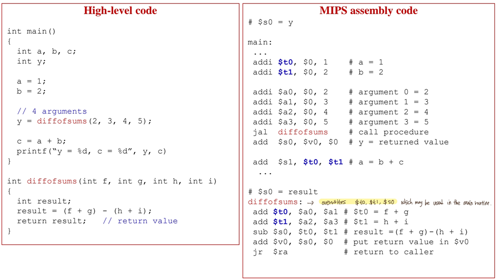 Non-Preserved : $t0~$t9 (temporary)