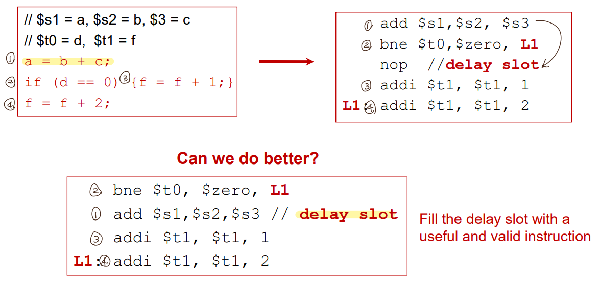 delay slot 에 useful instruction을 담아준다. 없다면 nop(no operation).