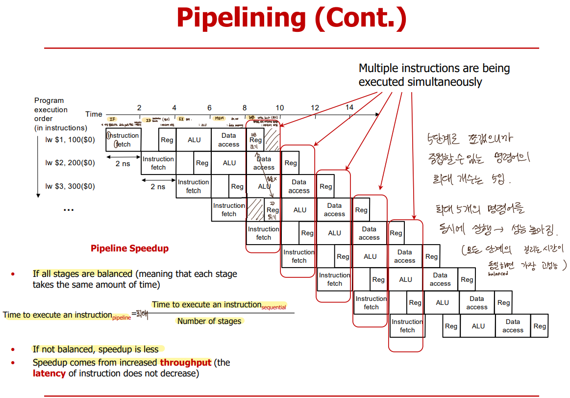 Pipelining 기법의 목적은 Throughput을 높이는 것임!! -> 여러개의 명령어를 병렬로 실행함.