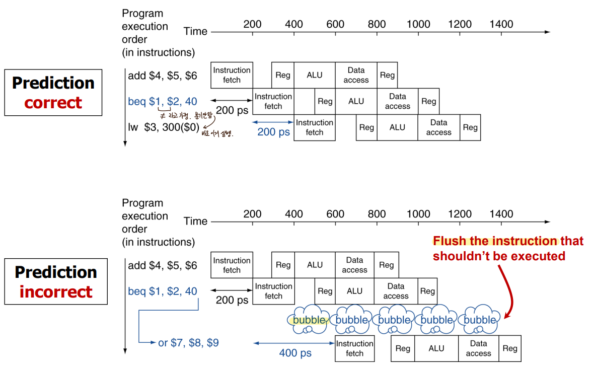 Our MIPS 는 branch-not-taken predictor (with no delayed branch)