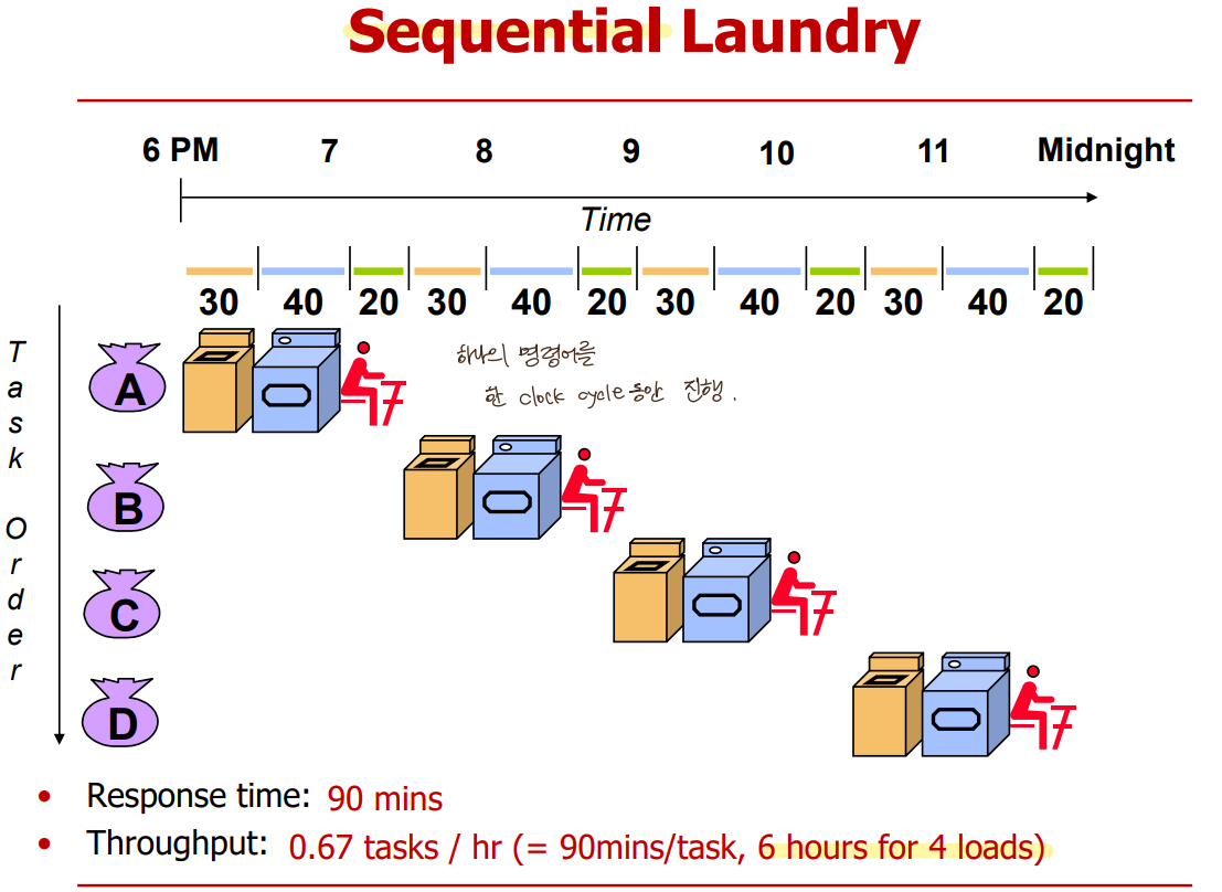 명령어 실행시간(pipeline) = 명령어 실행시간(sequential) / 단계(stage)의 수