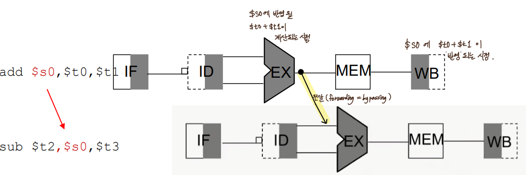 sub 명령어에서 사용할 $s0는 add의 WB 시점에 결과반영되므로 기다려줘야함 -> 2 cycle 손해봄