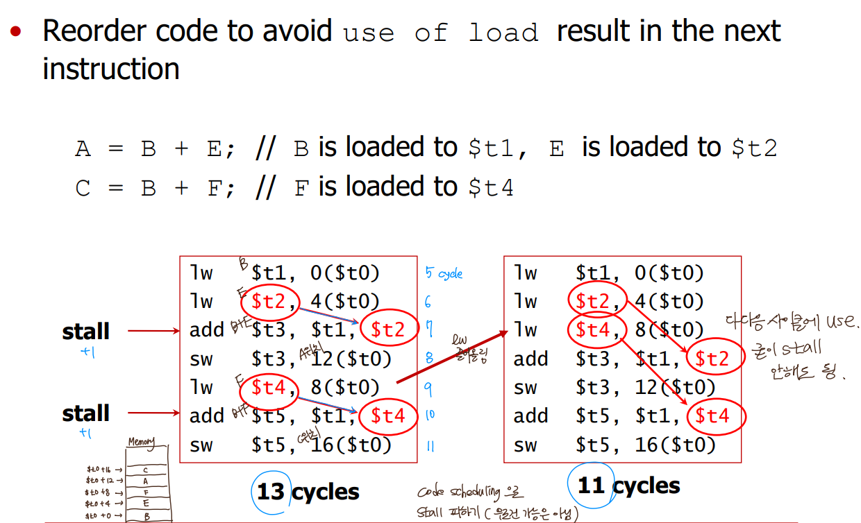 lw한 값을 바로 다음 사이클 말고 그 이후에 사용하면 굳이 stall 안해도 됨.