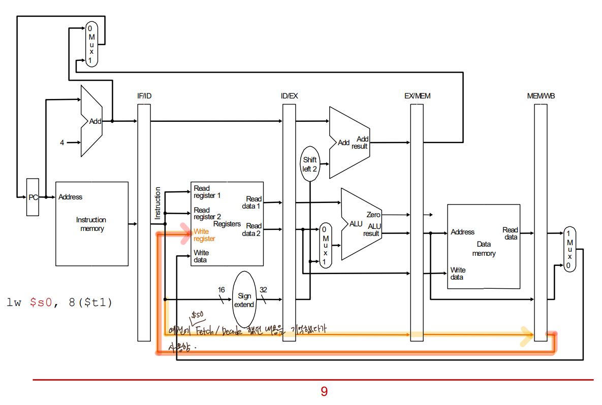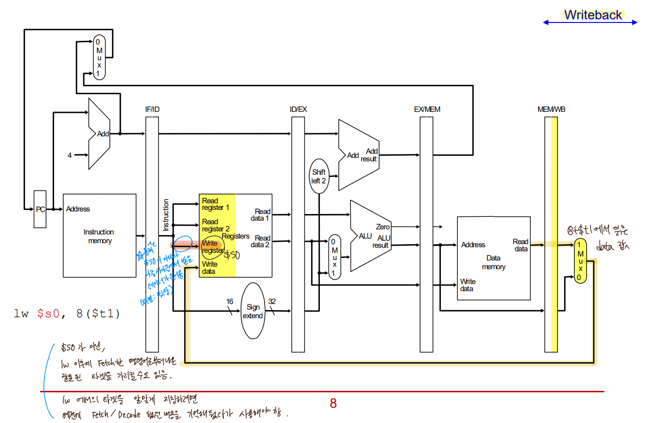 : WB 단계에서 lw $s0, 8($t1) 명령어를 처리중인데, 그 시점에 Write register 에 접근하면