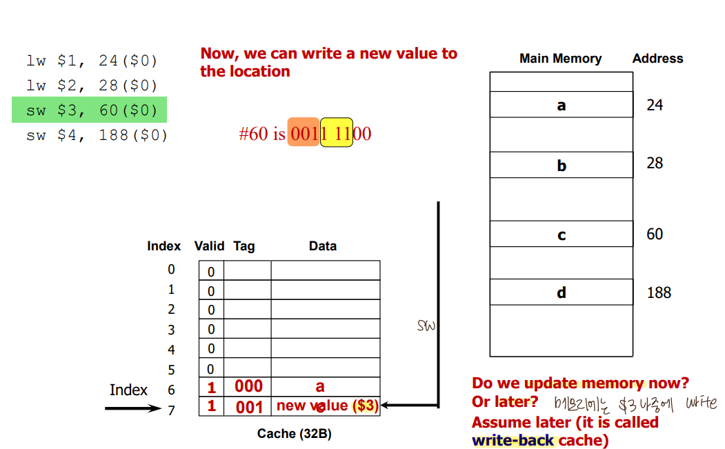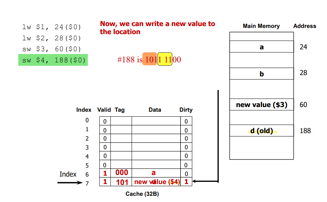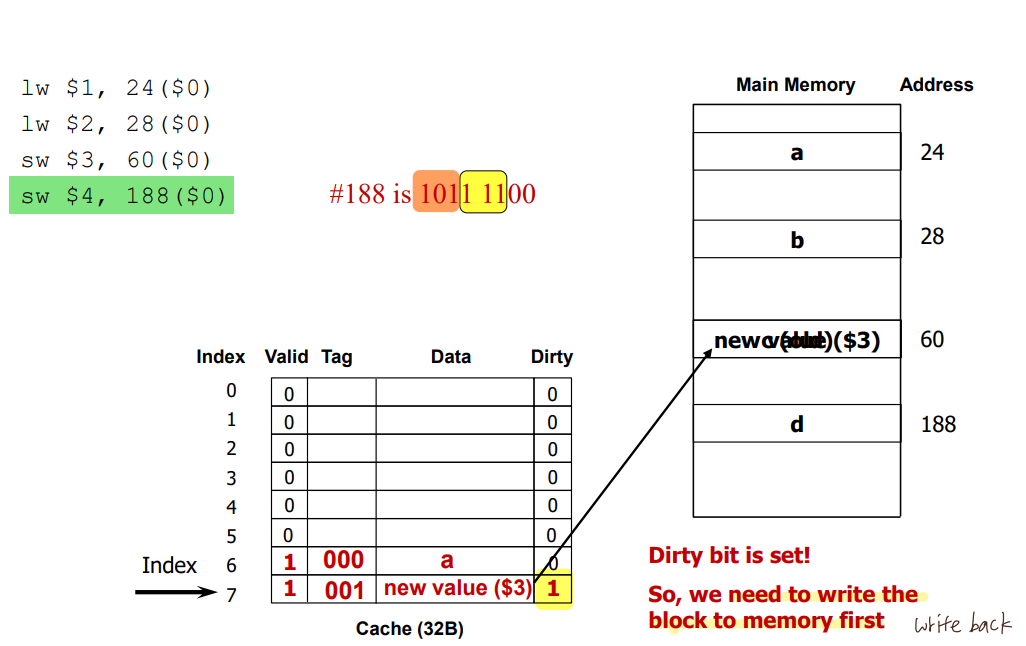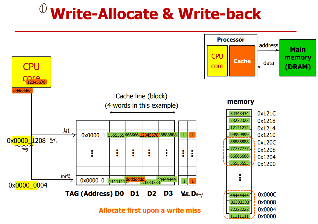 2) Write-through: update both the cache and the lower level of the memory hierarchy