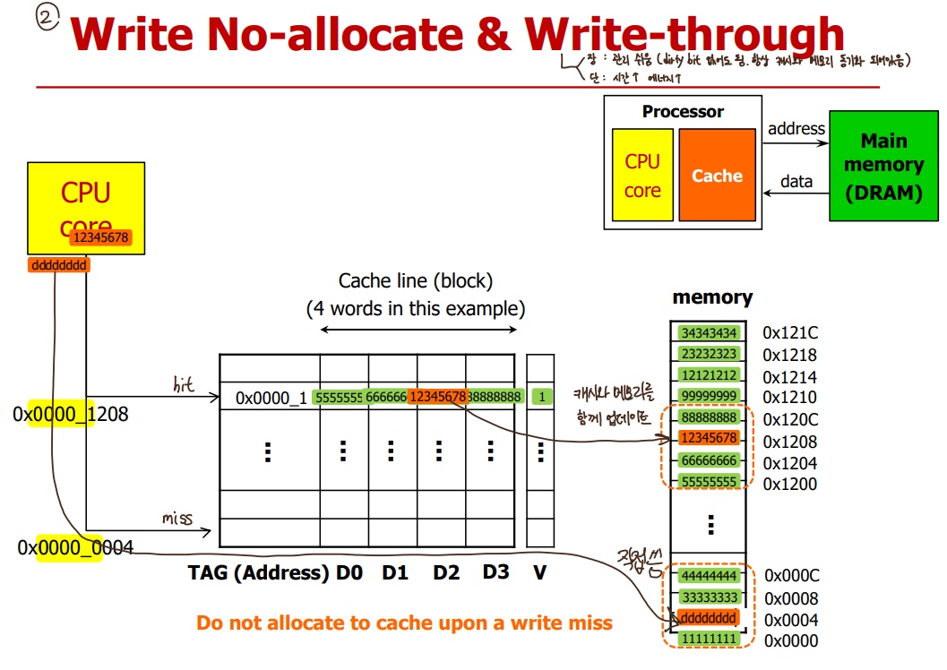 2) Write no-allocate with write-through: write the word only to the main memory