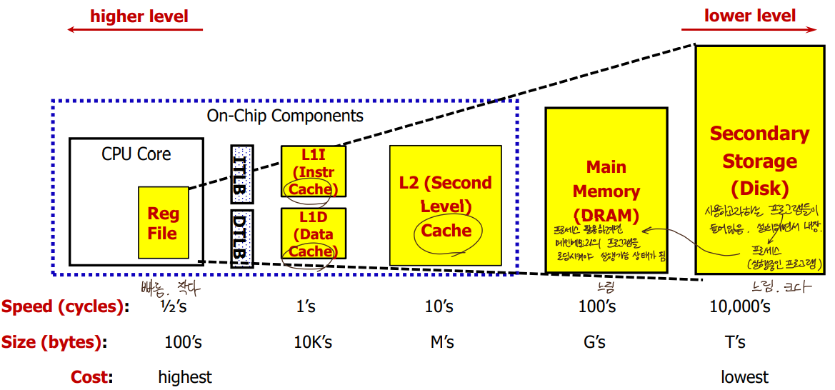 ex) SRAM(속도⬆,가격⬆) - DRAM - Magnetic disk(속도⬇, 가격⬇)
