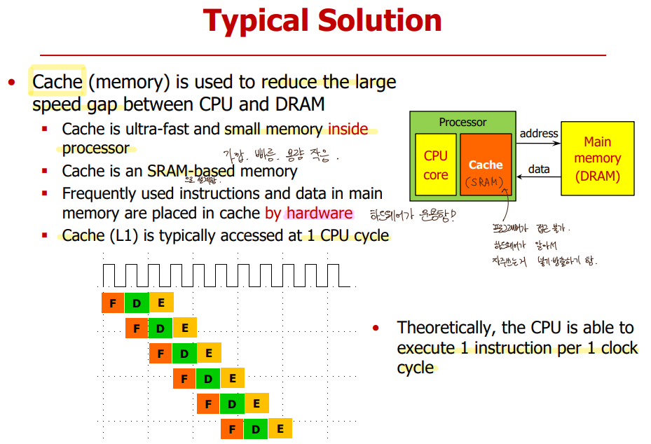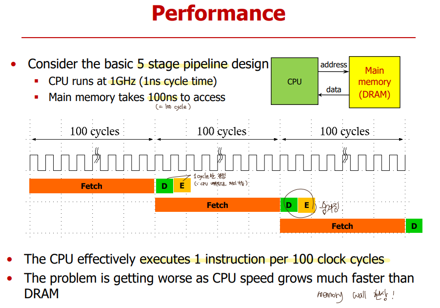 : CPU와 DRAM의 성능격차가 점점 커져서, 성능 결정이 거의 메모리에 의해서 됨.
