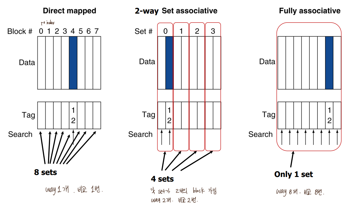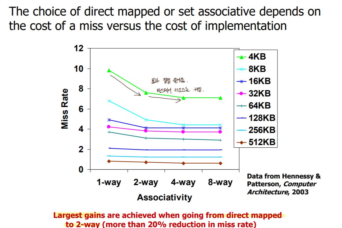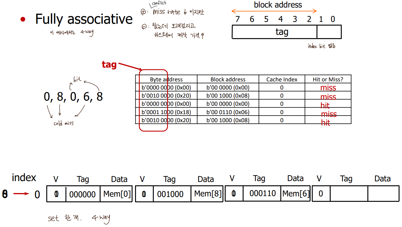 무조건 fully associative 가 좋은건 아님. way 많아질수록 하드웨어 cost 증가함.