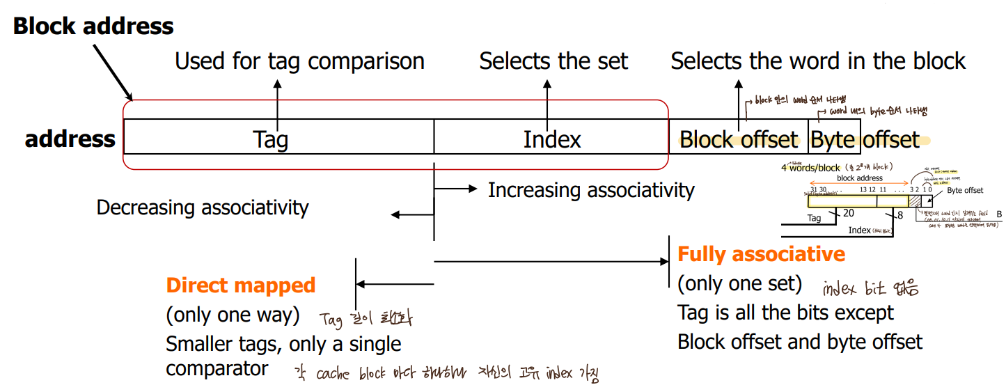 ex) associativity 4 ways -> 8 ways : size of the index -1 bit, size of the tag +1 bit
