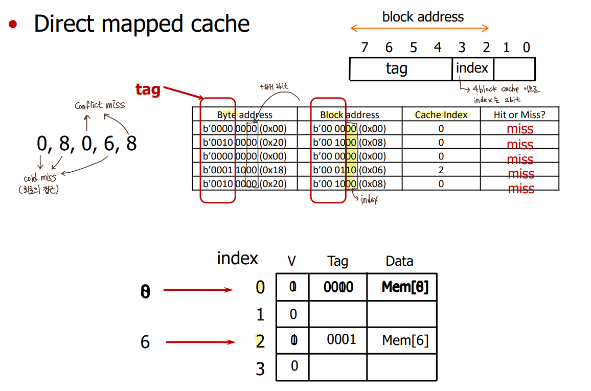 예시) cache with 4 oneword blocks, CPU generates 8-bit address to cach