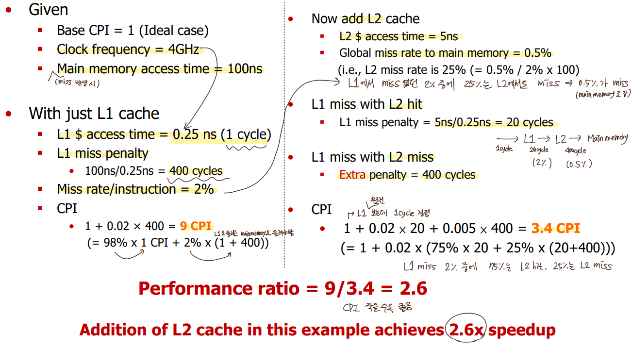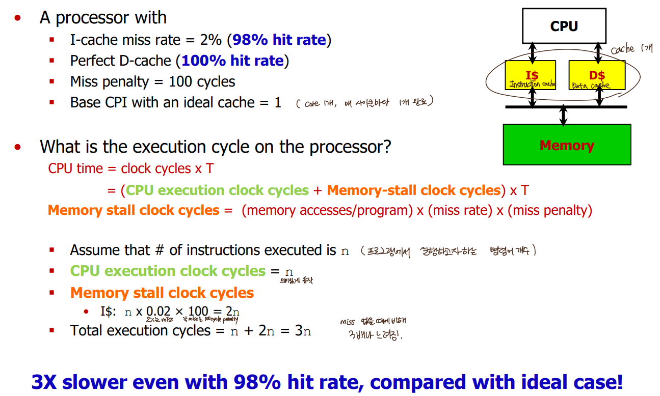 => 총 메모리 접근대비 miss비율(=프로그램의 miss개수) * miss 1회당 패널티