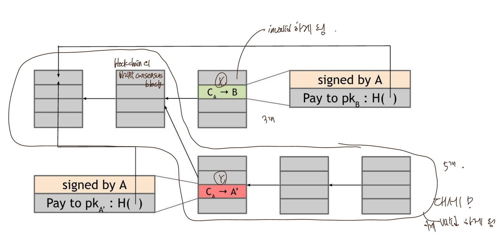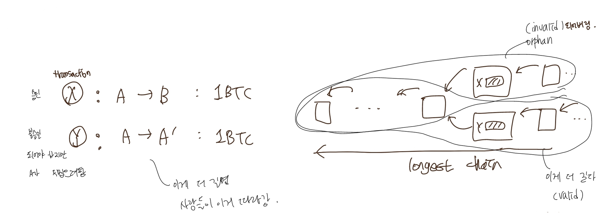 -> Y쪽이 longest chain이 된다면 X가 불승인(invalid), Y가 승인(valid)됨 -> B에게 1btc가 지불되지 않음.