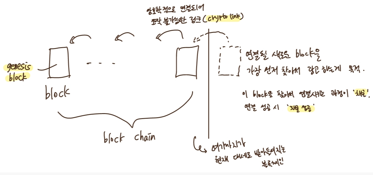 - 채굴자들은 block's data로 crypto hash 계산함. special part에 임의의 숫자 넣기를 반복함.(mining)