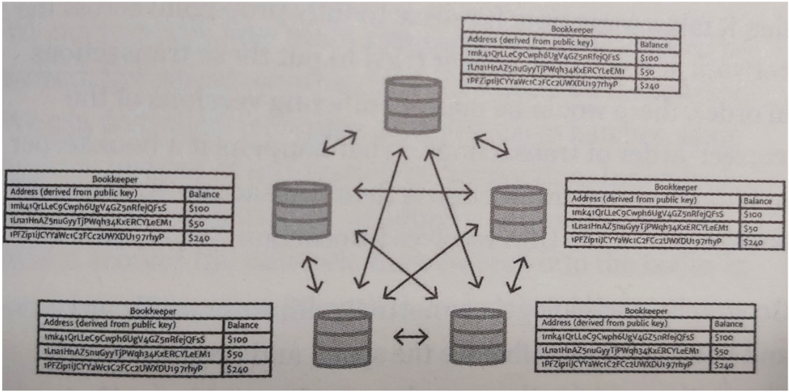 : 각 노드(=컴퓨터, 데이터베이스)마다 각각 장부를 가짐. 각 노드는 network로 연결됨.