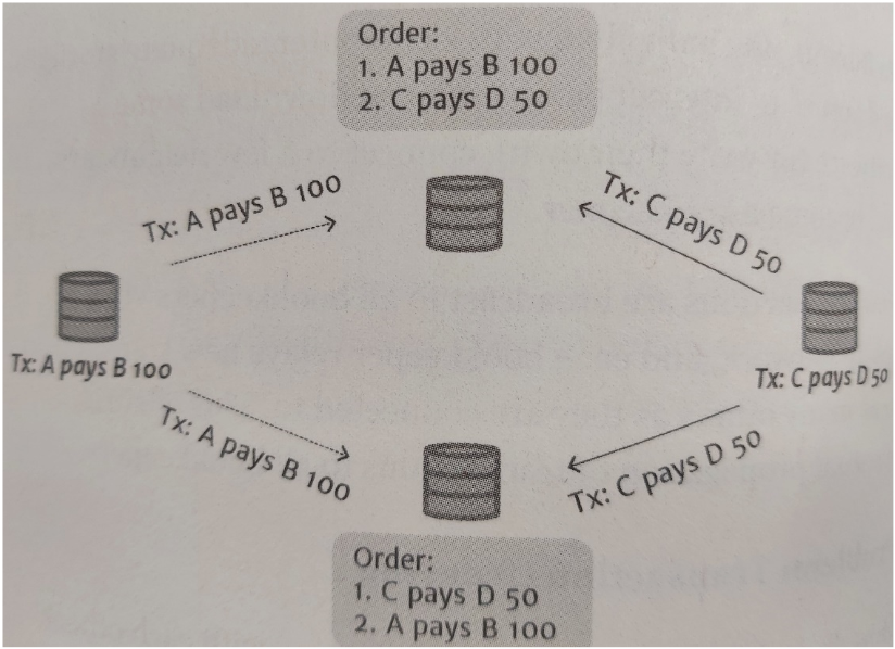 ①A pays B 100과 ②C pays D 50이 서로 독립사건이 아니라면 transaction순서가 중요함.