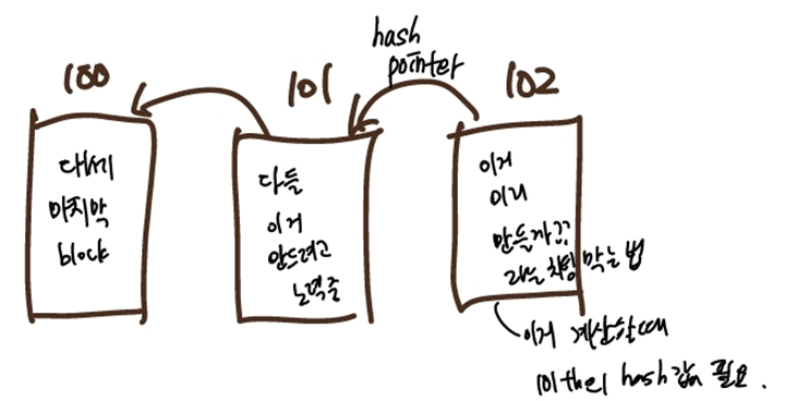 102th 블록을 계산하려면 이전 블록(101th)의 hash 값 정보가 필요함.