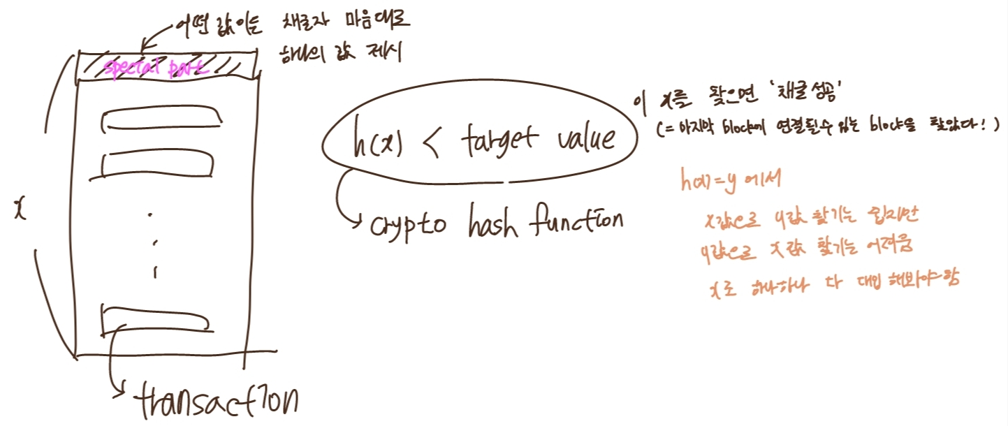 : h(x) < taget value 인 x를 찾는 데 성공하는 게 채굴임. 여기서 target value를 낮추면 난이도 올라감.