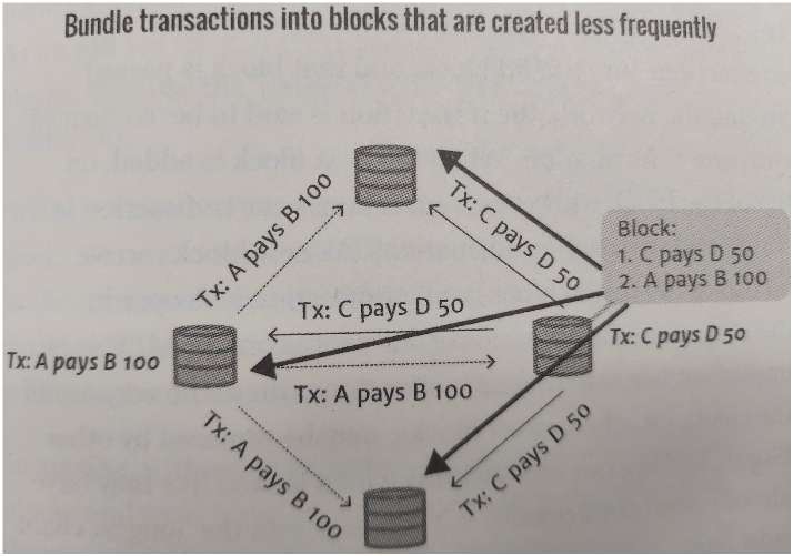 transaction들을 모아서 block(약 1MB)을 만들고 뭉탱이로 배치 처리함.