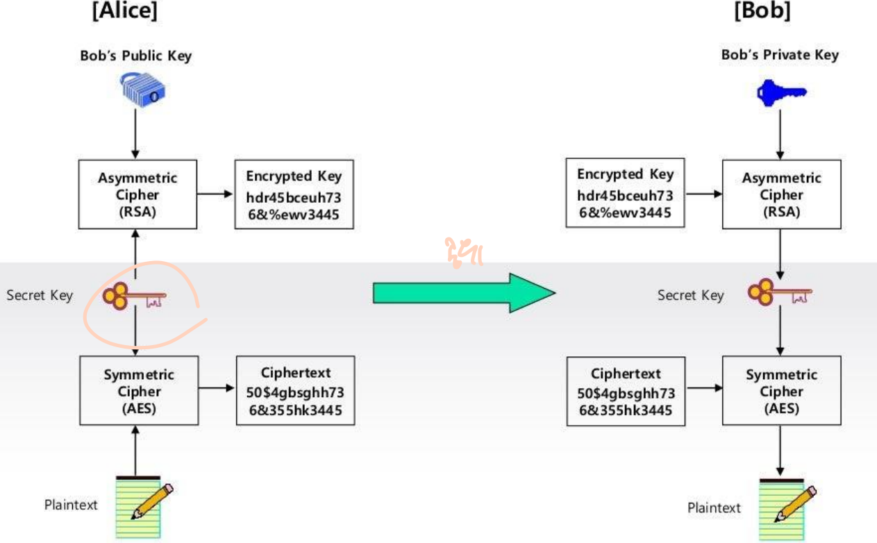 : h(keyA-B, M)와같은 keyed-hash. 이때 괄호 안의 콤마는 단순히 이어붙인 걸 의미함. - Hybrid Encryption (Digital Envelope)