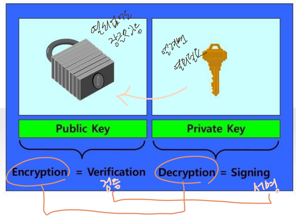 - Private Key : 열쇠(Decryption)-열려면 열쇠 필요, 서명(Signing)