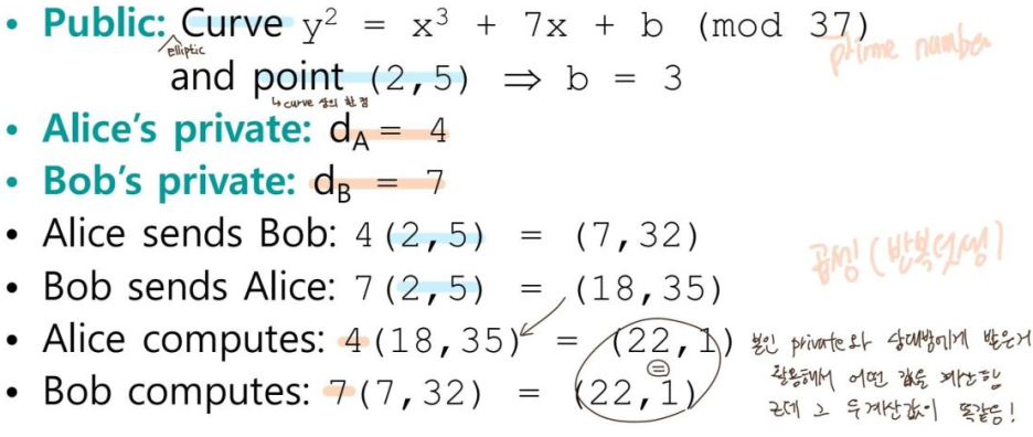 : 안전한 key exchange가 목적. descript log에 기반함. - ECC