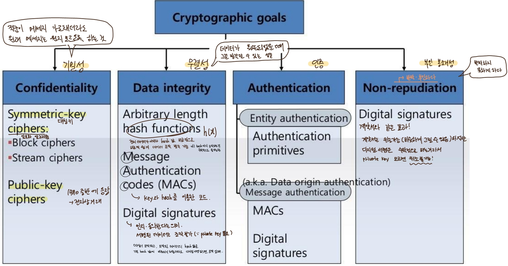 private key로 인증 - 디지털서명은 integrity(진실성) & non-repudation(부인 방지)을 제공함