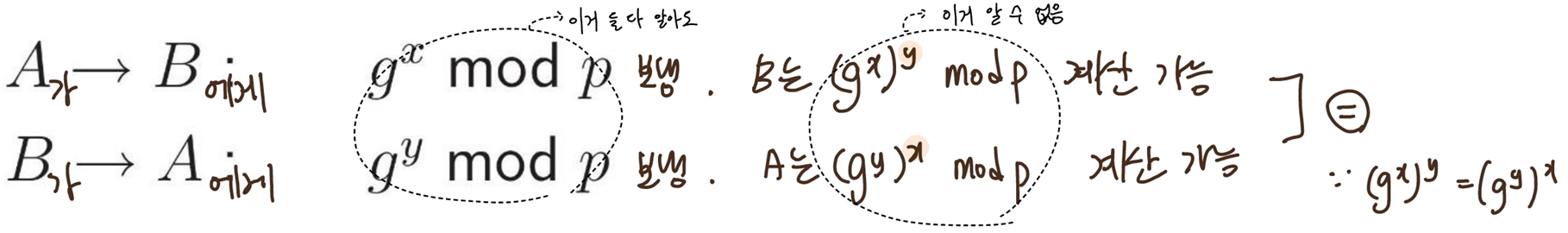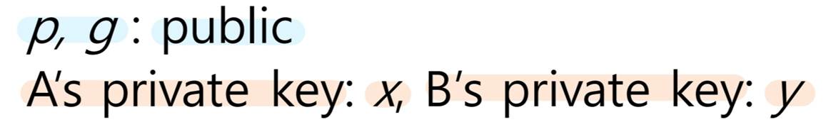 -> 본인의 비밀값과 상대방에게 받은 공개값으로 계산함.(계산 결과 동일하다는 보장이 있음)