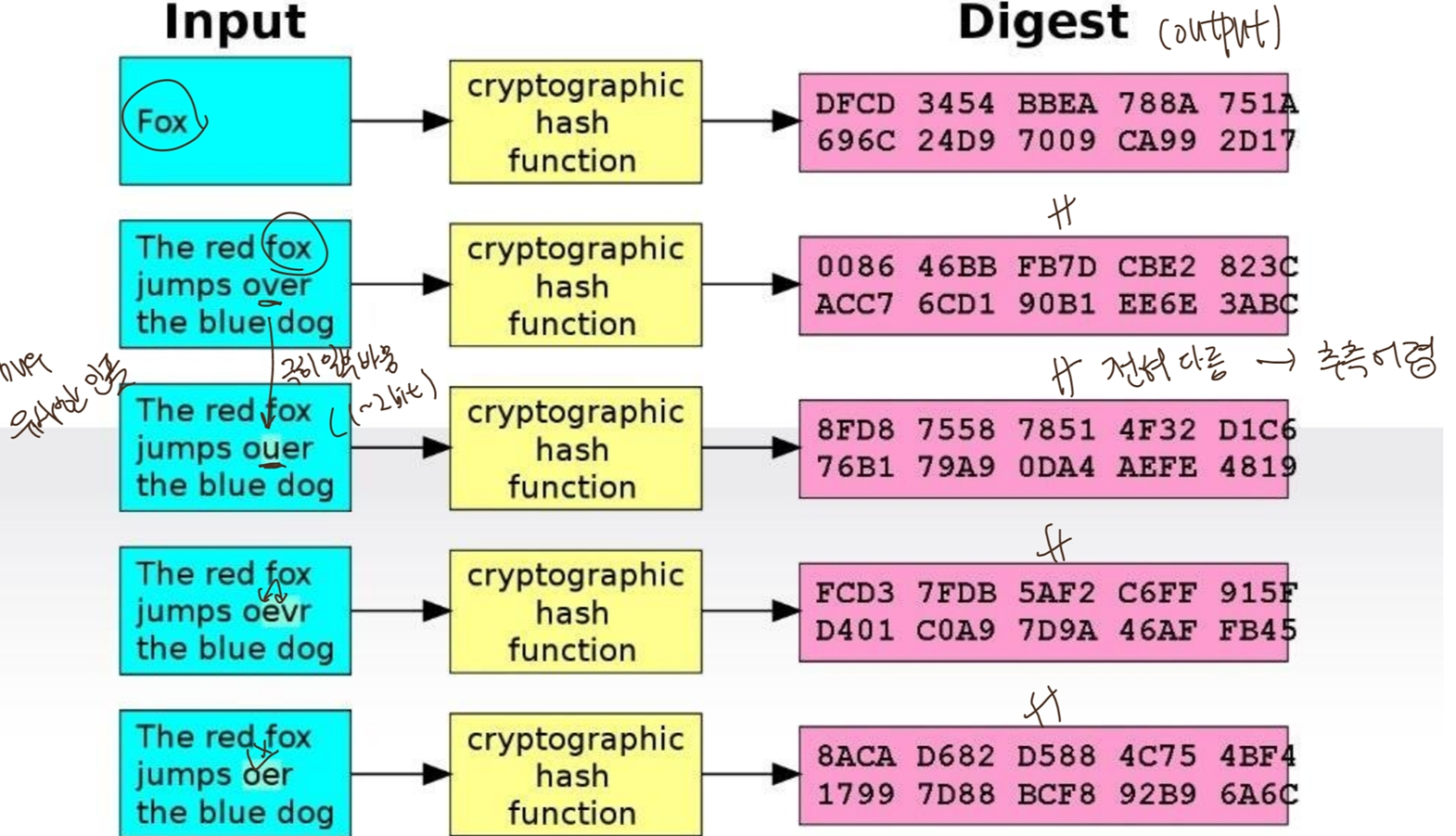제대로 된 crypto hash function은 완전히 다른 2개의 output을 만듦.