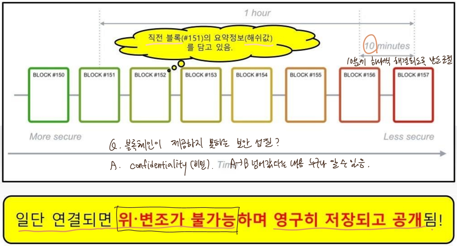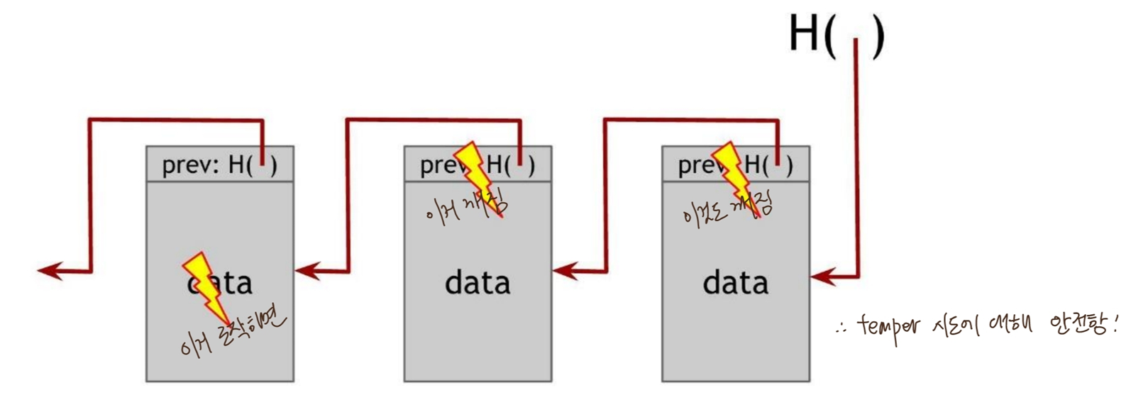 : data 조작하면 다음 block의 hash pointer가 incorrect하게되므로 조작을 detect할 수 있음.