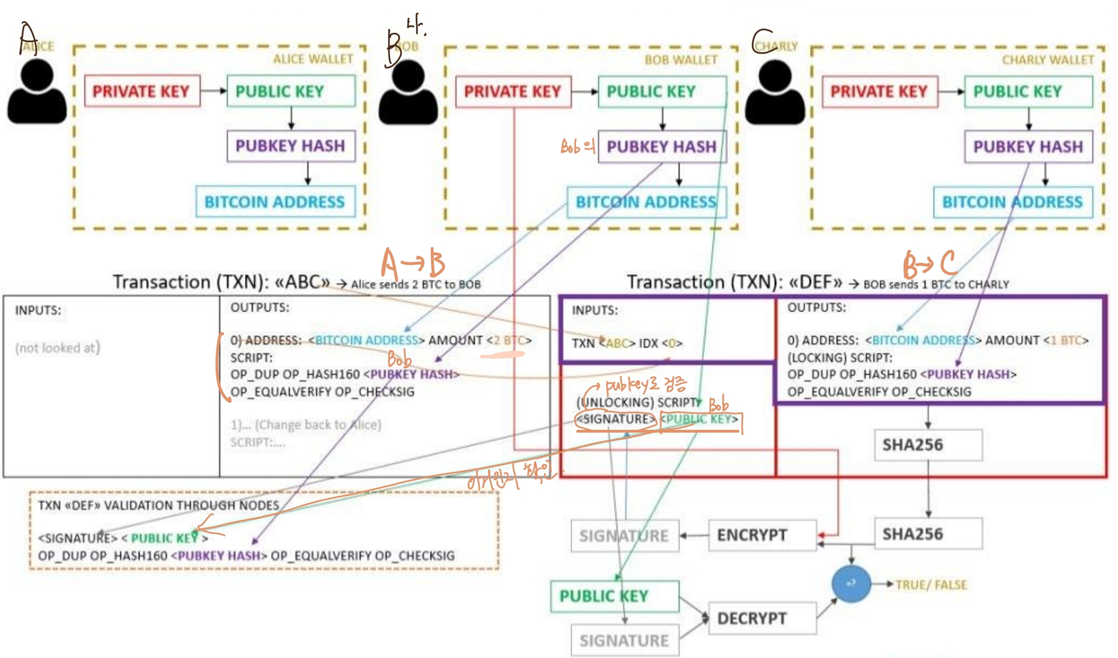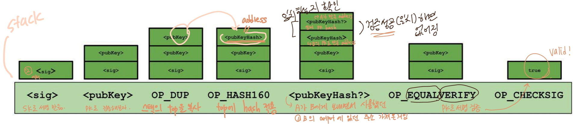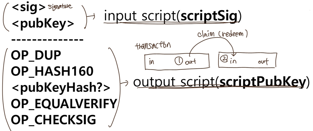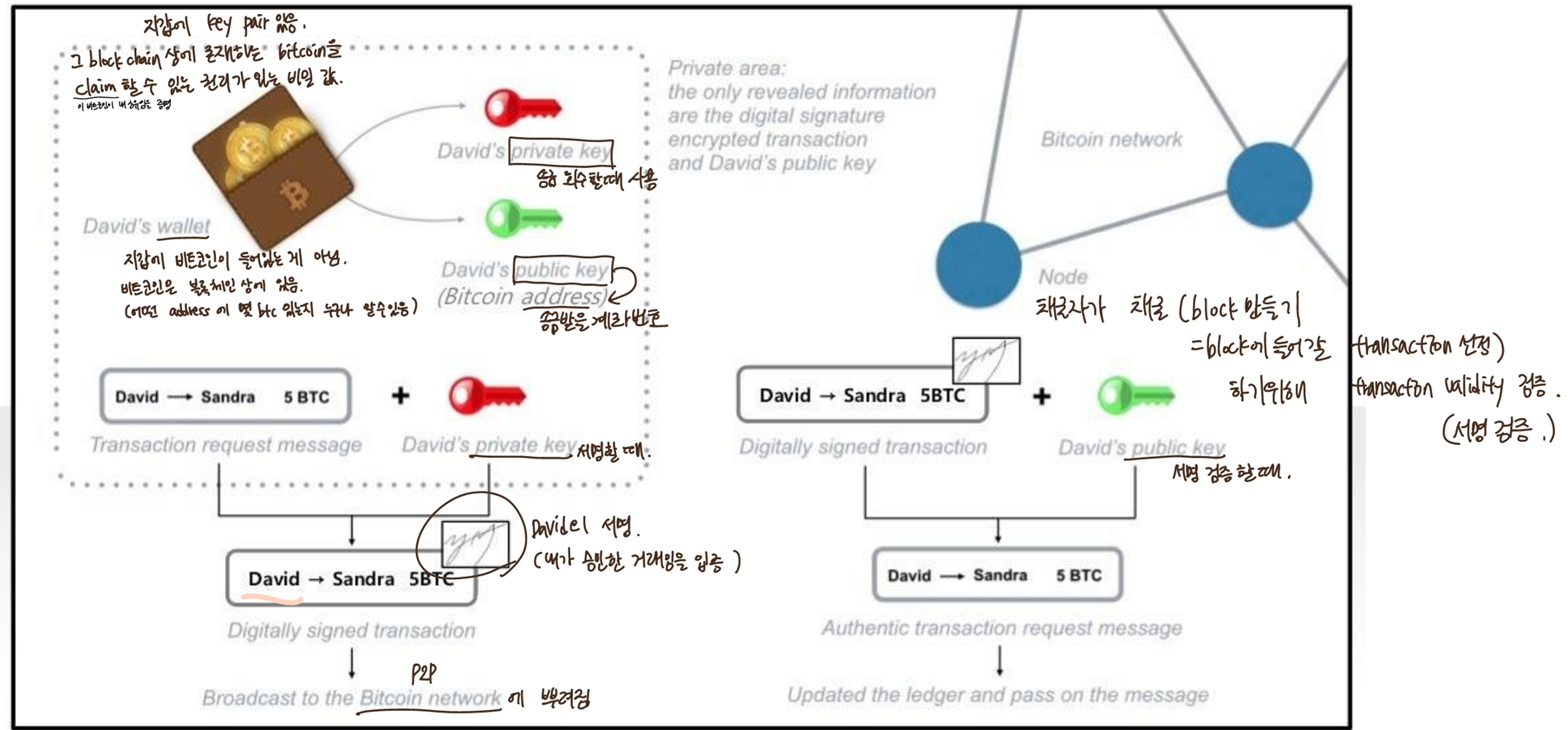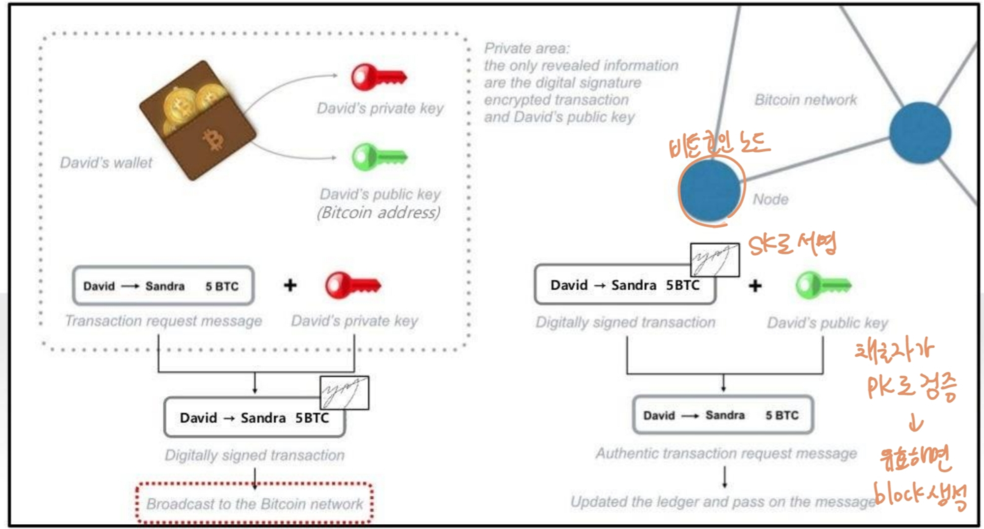 SK로 서명 -> 채굴자가 PK로 검증(invalid한 transaction 포함한 block은 인정되지 않음.)