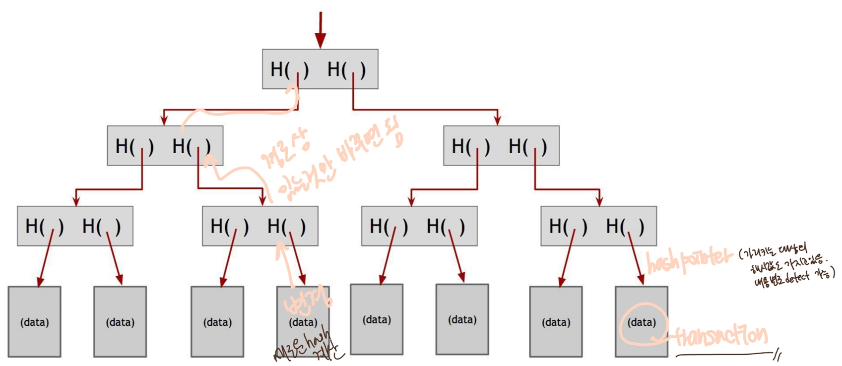 -> 정보 위치 알아낼 수 있음 + hash pointer가 가리키는 곳의 정보 변경 detect 가능.(integrity)