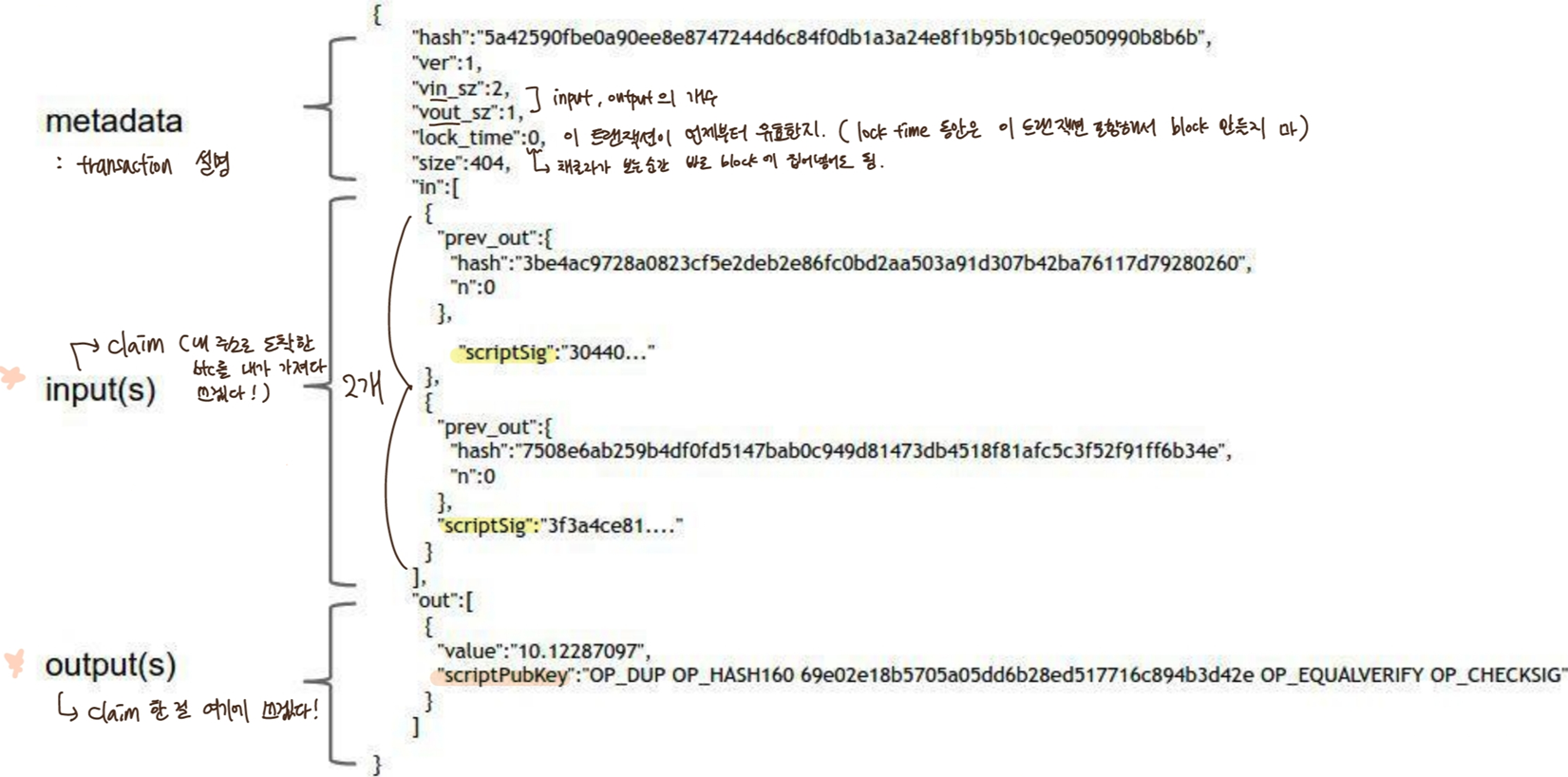 - input이 이전 output을 clain(redeem)해주는 게 아님. 그냥 null hash pointer임.
