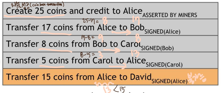 Bitcoin 블록체인 상에는 주소(계좌)의 잔액은 기록되어있지 않음.