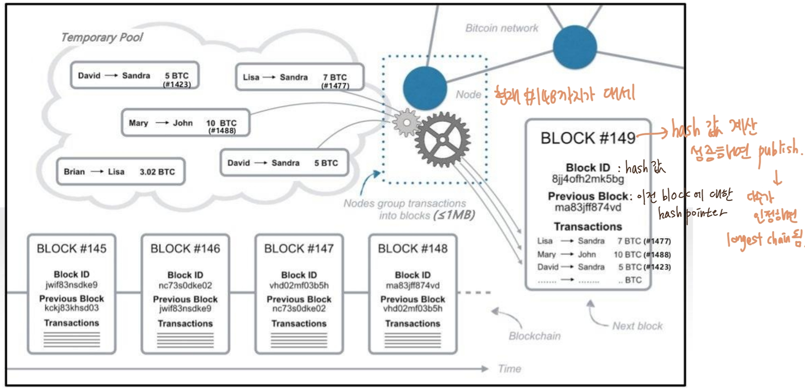 좀 더 수월하게 합의 이루기 위해 다량의 transaction 모아서 block 만들어서 block by block 합의 함.