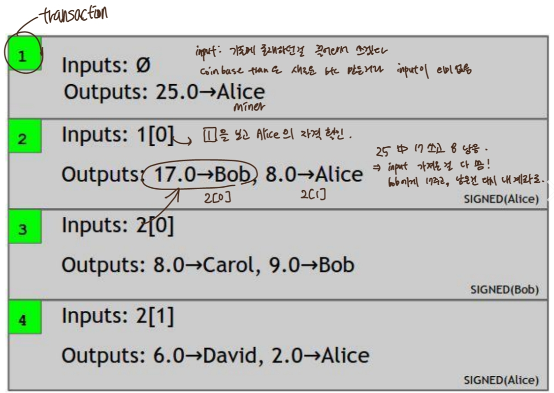 - single input(인풋은 의미 없음. NULL값), single output(채굴자가 block reward받기 원하는 주소)